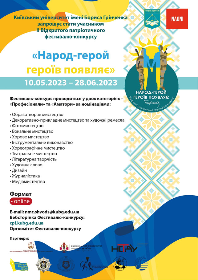Мета Фестивалю-конкурсу – поширення патріотичних ідей засобами мистецтва, виявлення і підтримка талановитої молоді, сприяння становленню української та європейської ідентичності, заохочення до патріотичної творчості захисників і захисниць України через участь у мистецьких проєктах. Фестиваль-конкурс «Народ-герой героїв появляє» проводиться у двох категоріях – «Професіонали» та «Аматори» за номінаціями: